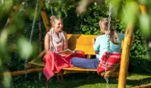 Na záhrade si nájdu všetky vekové kategórie svoje miesto. Čítacia lavička, miesto pre hru a pingpongový stôl pre väčšie deti ako aj obľúbený čižmičkový potôčik pre najmenších, kde sme pre dozerajúce maminy pripravili hojdačku z agátového dreva. Na bočnej záhrade sa nachádza pevné detské ihrisko s hojdačkami a domčekom. Na záhrade sa nám udomácnili aj farebné slimáčiky ulitníky, o ktoré sa hlavne malé slečny veľmi rady starajú.