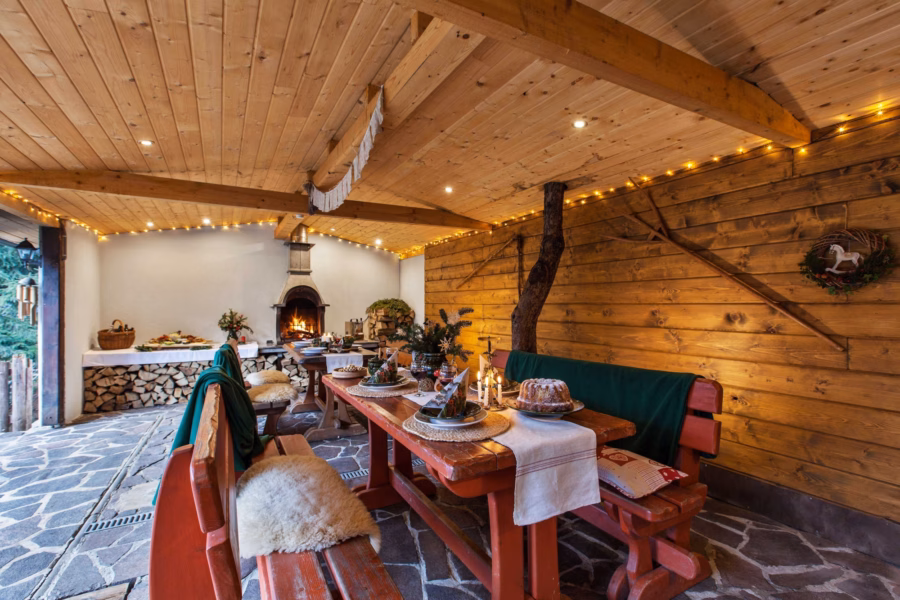 Veľký altánok 9x5 m je priamo napojený na zadných vchod chaty, takže sa doň dostanete suchou nohou. V chladnejších mesiacoch alebo horšom počasí je možné altánok od záhrady uzavrieť priehľadnými rolovacími plachtami.