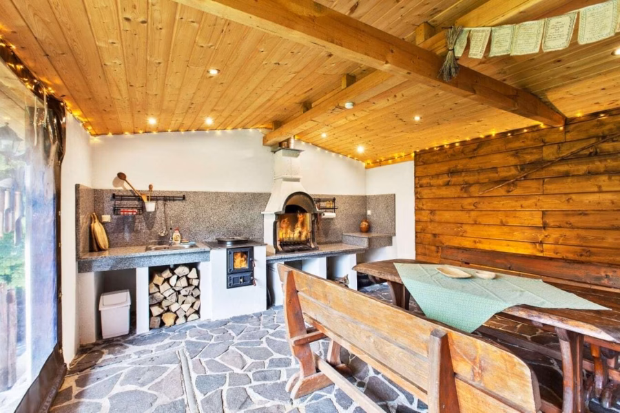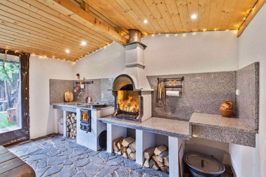 Dominantou altánku je letná kuchynka s krbom na grilovanie a sporákom s integrovanou 30 l kotlinou na guláš. Nájdete tu kompletne vybavenie na prípravu a varenie tradičných chatárskych dobrôt.